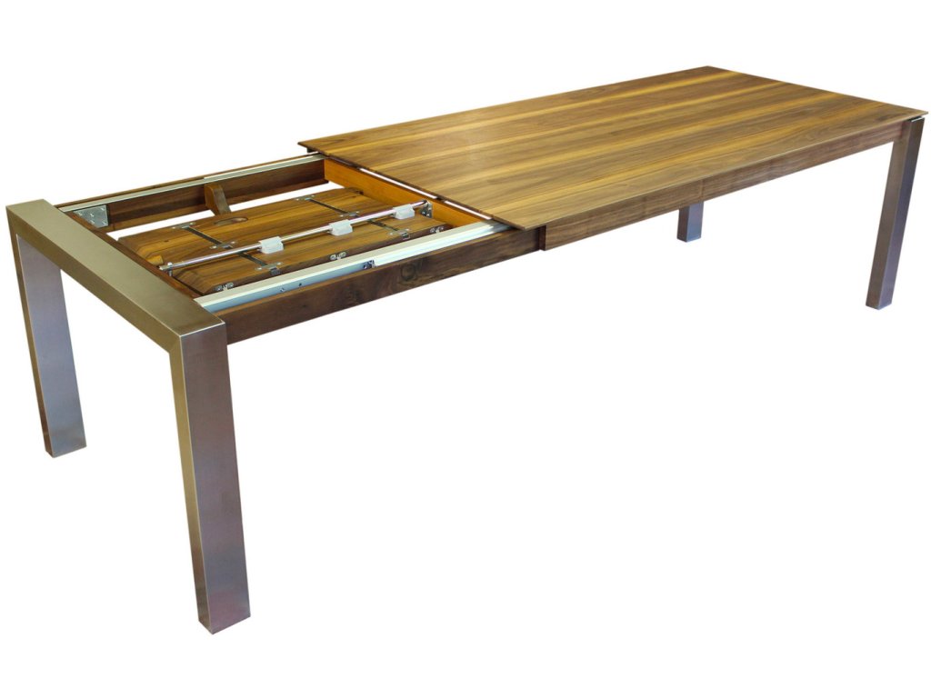 Vysoká pevnost u rozkládacího stolu a snadná manipulace s rozkládacím systémem je dána užitím kvalitních výsuvných systémů a také tím, že nohy stolu odjíždějí spolu s rozkládacími deskami. Díky tomuto systému se již nemusíte obávat, že některý z vašich hostů bude muset sedět v místě, kde u jiných stolů překáží noha a ztěžuje tím pohodlné stolování. S tímto systémem je noha vždy na konci stolu, ať je složený, nebo rozložený. Rozkládání je možné o 70 cm, 95 cm a 2×47 cm.